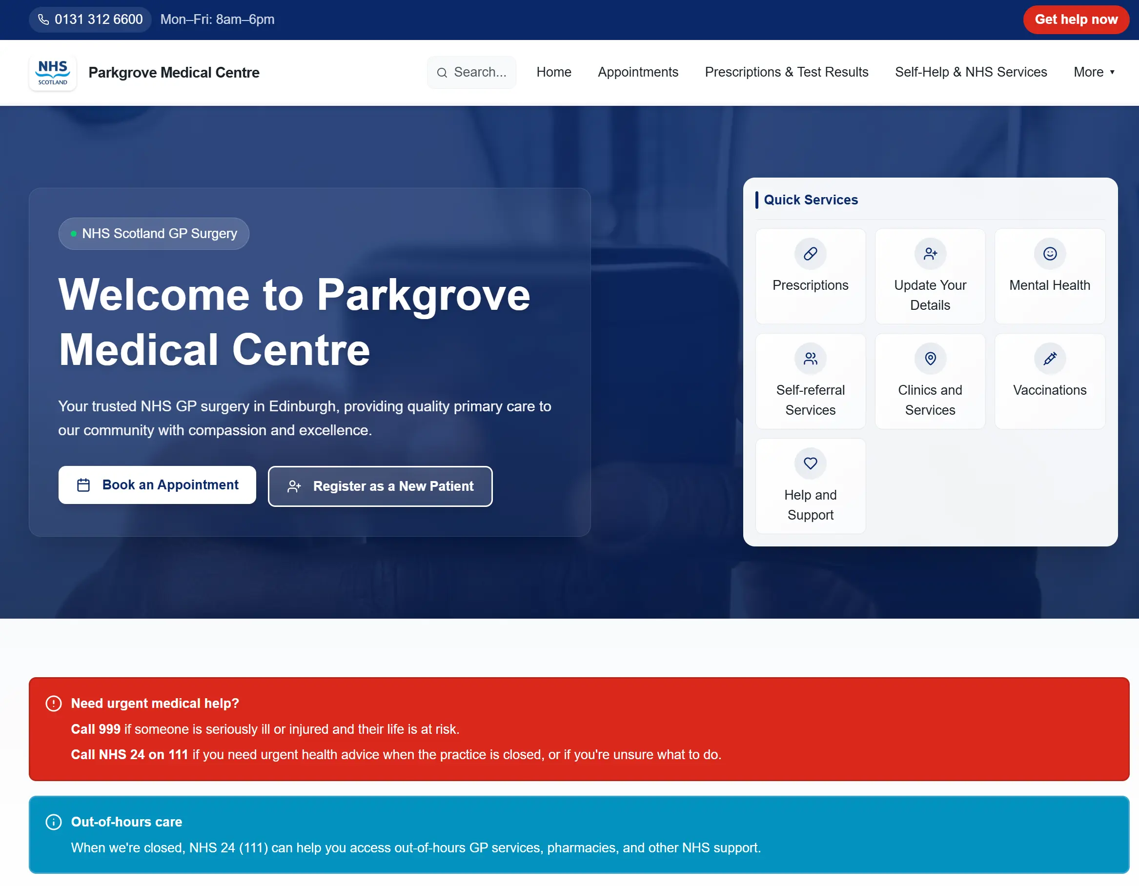 A comprehensive NHS Scotland GP website serving the Cumbernauld community. Features live NHS Lanarkshire news integration, Pharmacy First Scotland guidance, and extensive self-help resources.